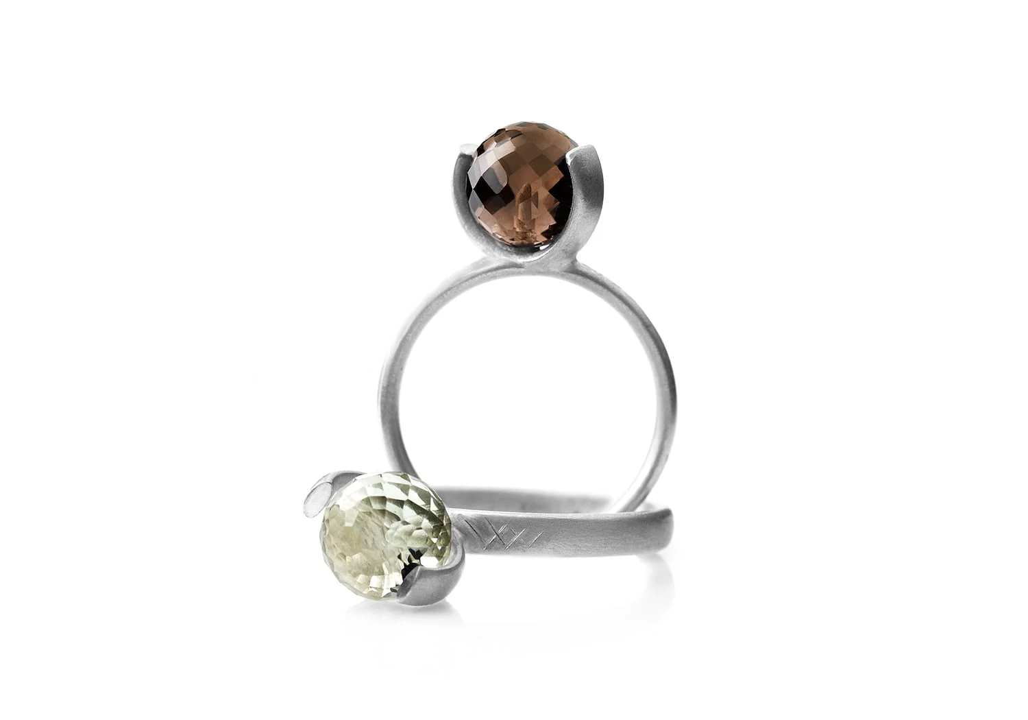Sterling silver and round, facetted 8 mm gemstone. Made with amethyst, blue topaz or smoked quartz.
